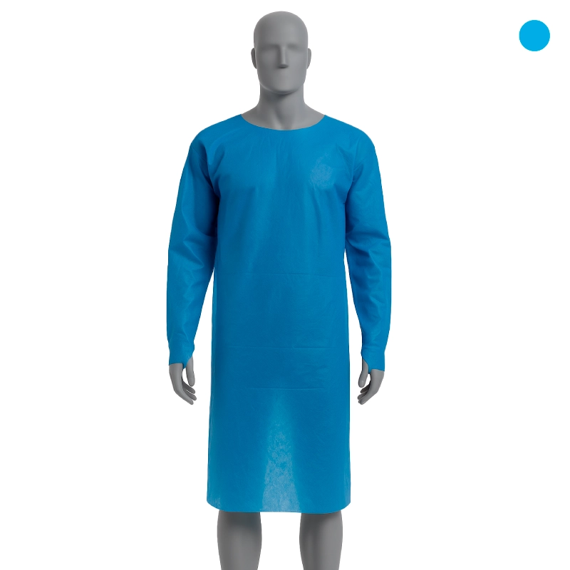 CPE (Cast Polyethylene) gown for minimal risks and single use. It features waist ties at the back, a rounded neck opening with tie closure, and long sleeves with thumb loops to provide enhanced protection, prevent sleeve roll-up, and ensure a secure fit during us