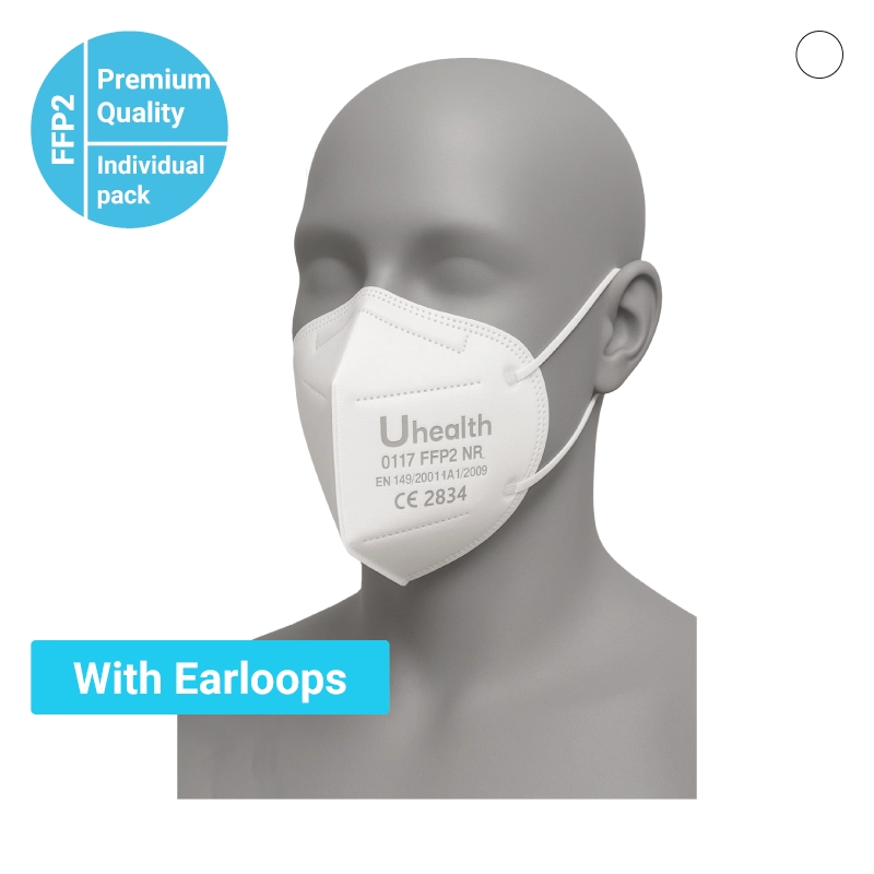 Personal protective FFP2 NR mask offering maximum filtration efficiency. Manufactured with four layers of non-woven fabric and melt-blown filtering material, featuring a moldable plastic-coated steel nose clip and two soft earloops (an ear-saver is included in each individual pouch).