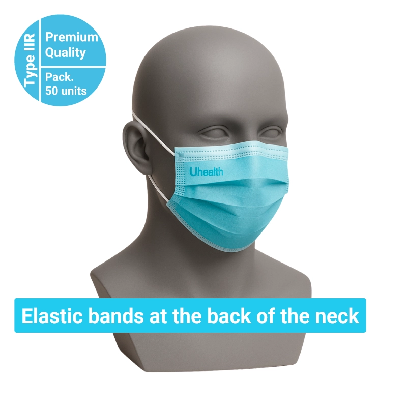 Premium Type IIR surgical mask offering maximum protection and high filtration efficiency. Manufactured with three layers of non-woven fabric and melt-blown filtering material, featuring a moldable plastic-coated steel nose clip and two soft behind-the-head elastic straps for a secure and comfortable fit.
