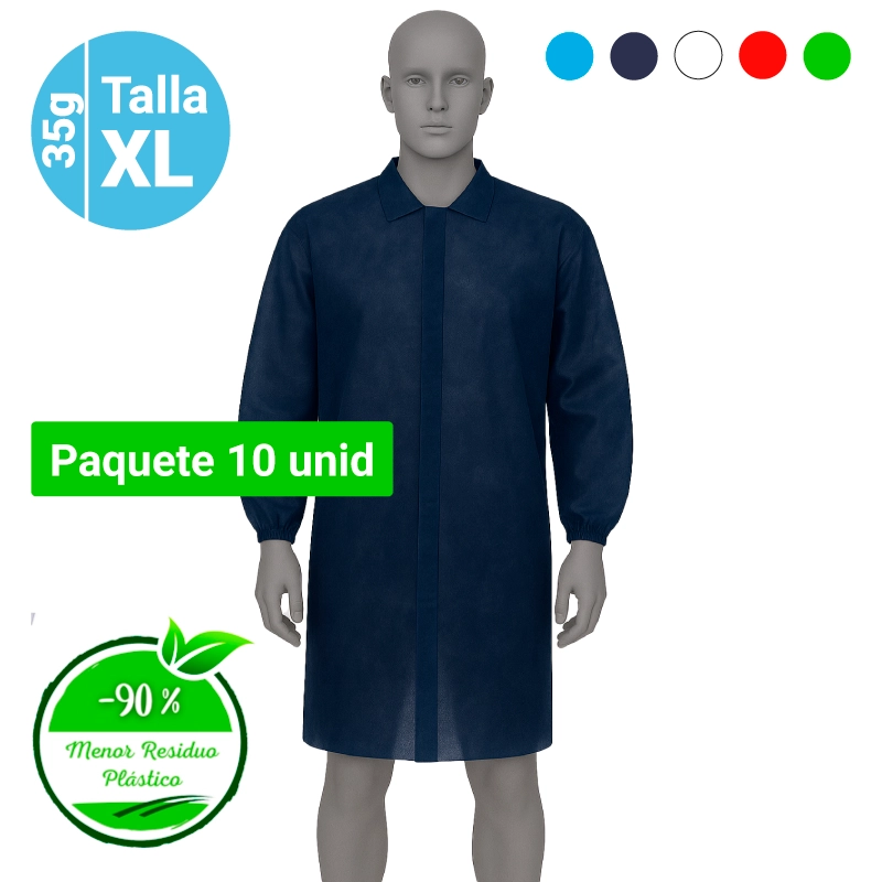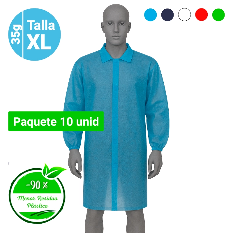 Bata de Polipropileno, cierre mediante 5 velcros, cuello tipo camisa y manga larga tipo raglán. Paquetes 10 unid – menor residuo plástico. Talla: XL – 112x138cm. Gramaje: 35grs metro cuadrado.
