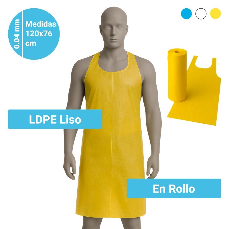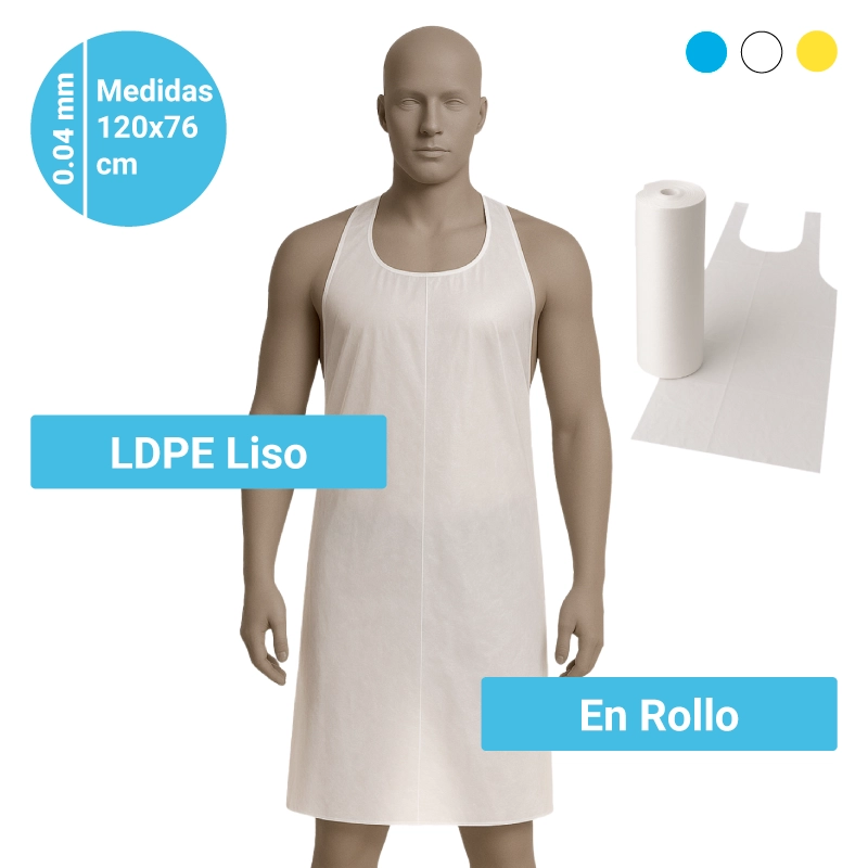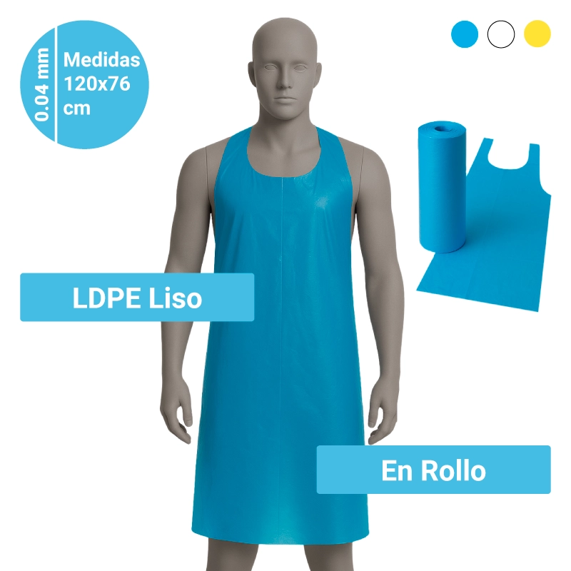 Delantal de Polietileno 0,02mm para riesgos mínimos y Un Solo Uso, ajuste mediante cintas a la cintura y abertura para la zona del cuello, total confort de uso y adaptabilidad.