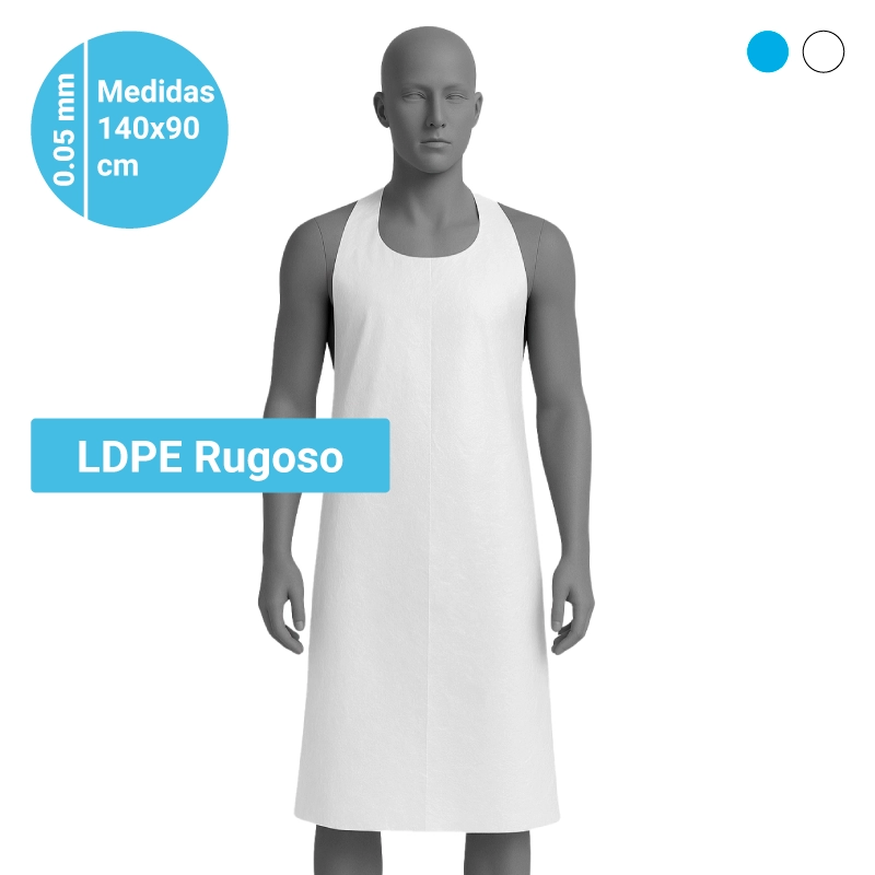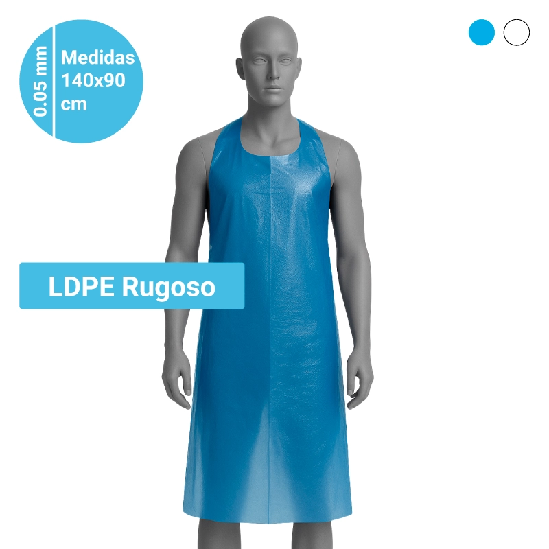 Delantal de Polietileno 0,05mm para riesgos mínimos y Un Solo Uso, ajuste mediante cintas a la cintura y abertura para la zona del cuello, total confort de uso y adaptabilidad.