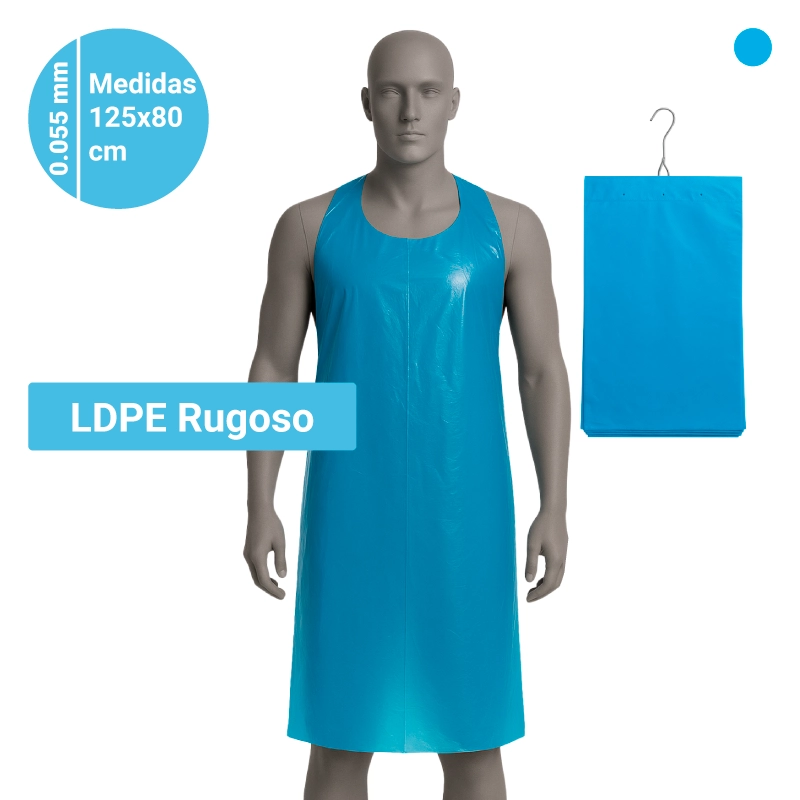 Delantal de Polietileno 0,04mm para riesgos mínimos y Un Solo Uso, ajuste mediante cintas a la cintura y abertura para la zona del cuello, total confort de uso y adaptabilidad.